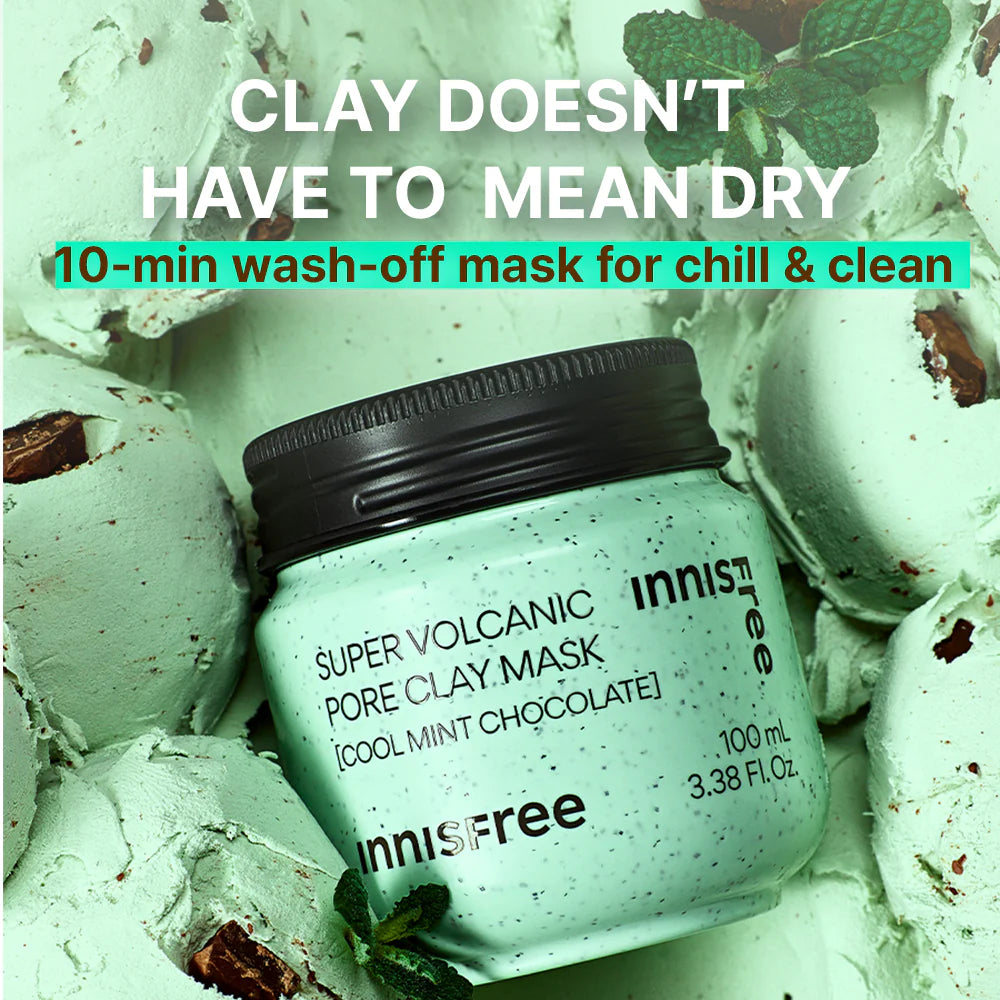 Indulge in a refreshing skincare experience with the Innisfree Super Volcanic Pore Clay Mask, a Korean K-beauty solution for oily and combination skin. Powered by volcanic clusters and AHA, this mint chocolate-inspired wash-off mask deeply purifies and detoxifies the skin. It draws out impurities, excess sebum, and blackheads, leaving your skin smoother, clearer, and more radiant.