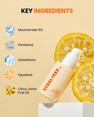 - Main Ingredients: Niacinamide 15%, Yuja Extract, Squalane, Glutathione, Vitamins C & E, Panthenol