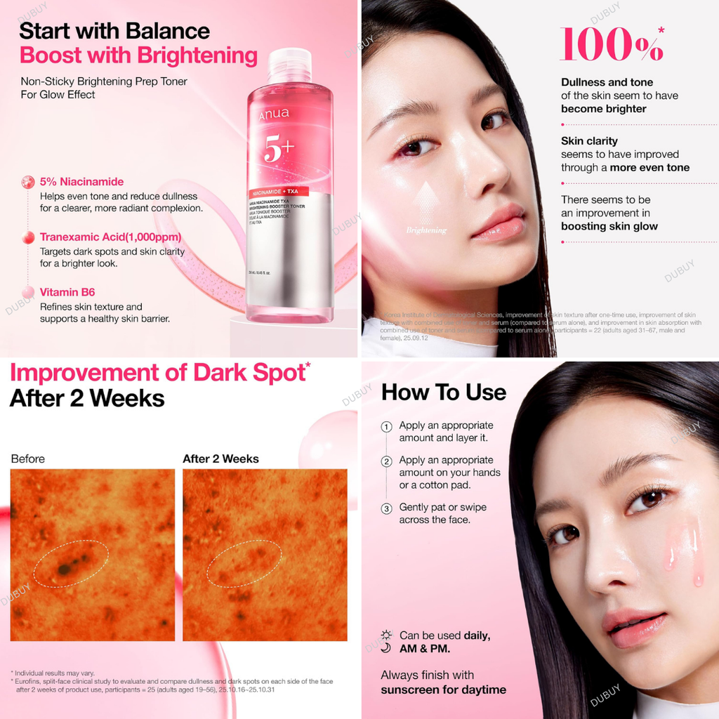- A brightening toner enriched with Niacinamide and Tranexamic Acid to help inhibit Melanin transfer and production, while providing deep hydration.