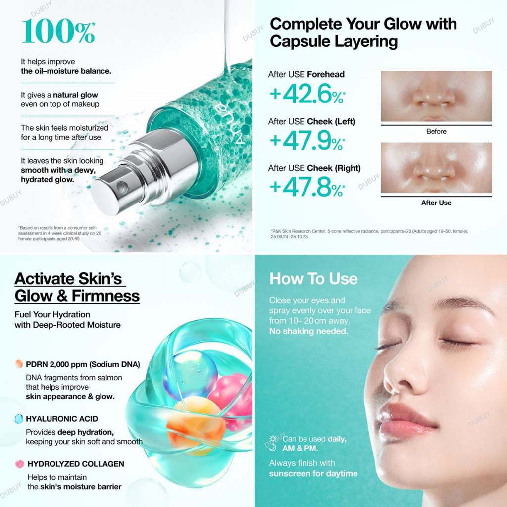 • A PDRN capsule mist formulated with 2,000ppm PDRN and Hyaluronic Acid to revitalize skin, boost radiance, and provide instant and long-lasting hydration for a smoother, softer complexion.