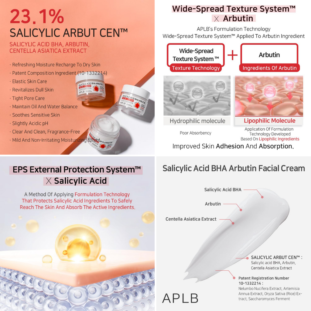 - A cream contains 23.1% Salicylic Arbut CEN that gives refreshing moisture recharge to dry skin.