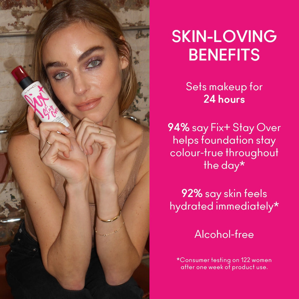 Keep your makeup flawless all day with the MAC Fix+ Stay Over Alcohol-Free 24HR Setting Spray. This innovative, alcohol-free formula is designed to lock in makeup for up to 16 hours while offering essential hydration and protection against environmental pollutants and blue light. Perfect for all skin types, this lightweight spray helps maintain your makeup's integrity, ensuring it stays color-true and transfer-resistant throughout the day.